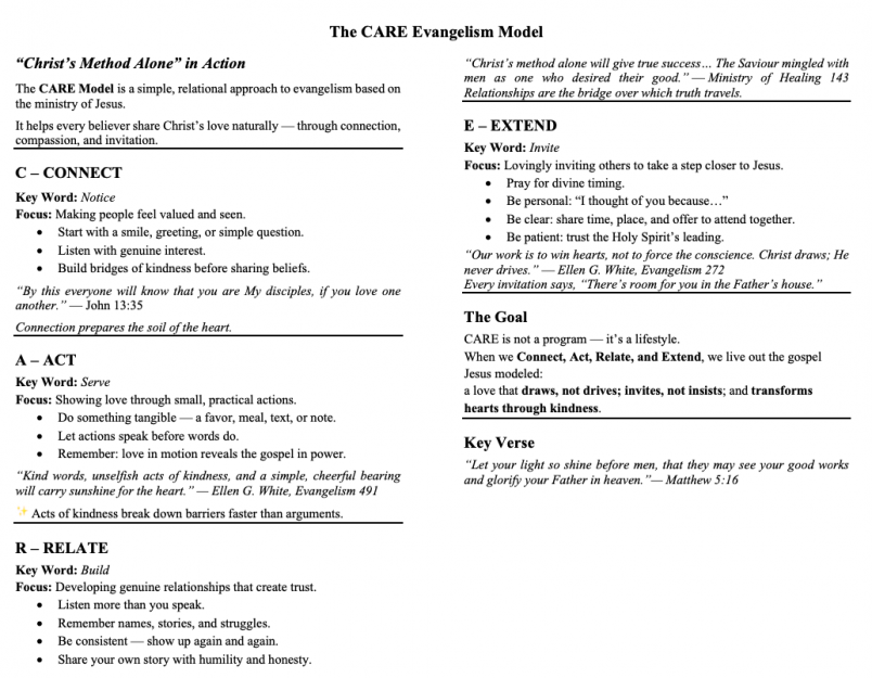 The weekend outline of events are attached along with the Evangelistic CARE Model. For more details about the evangelistic series and speakers click this Fearless for the Coming of Christ.